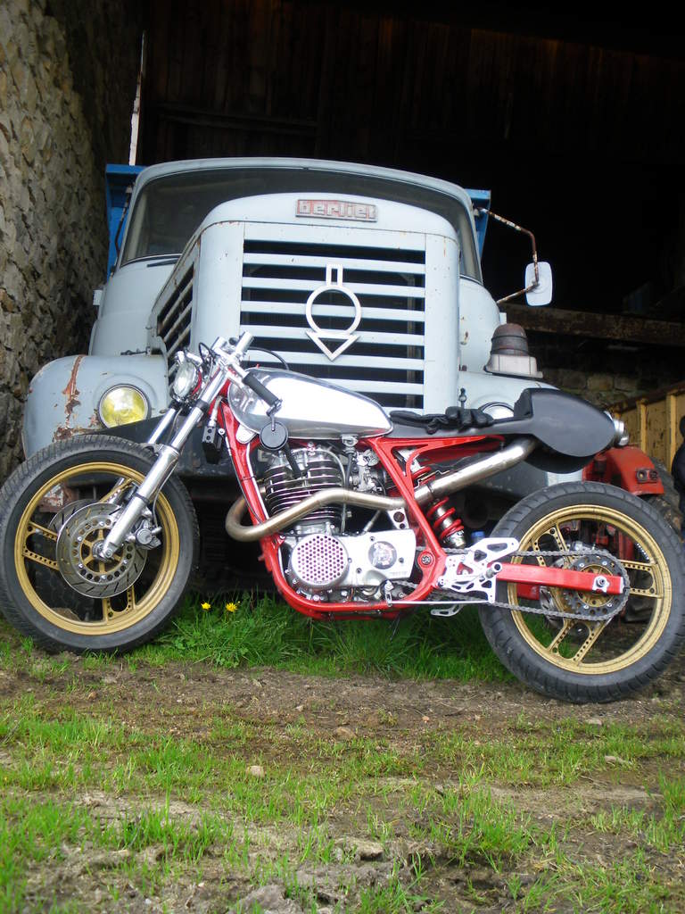 A problémát elnapoltuk, elővettük inkább a sárvédőt. Vagyis magát a problémát, hisz sárvédő nem volt; a 17-es kerék fölé pakolt FZR elem kuka. A modernebb felni sem passzolt a képbe, tudtam, hogy kell valami jobb. A szerencse sietett segítségemre, hisz a kézműves bőrnyergeiről ismert Nogg blogjának üzenőfalán kaptam a tippet, hogy nem messze Gyöngyöstől eladó egy kupacnyi XS400-alkatrész.